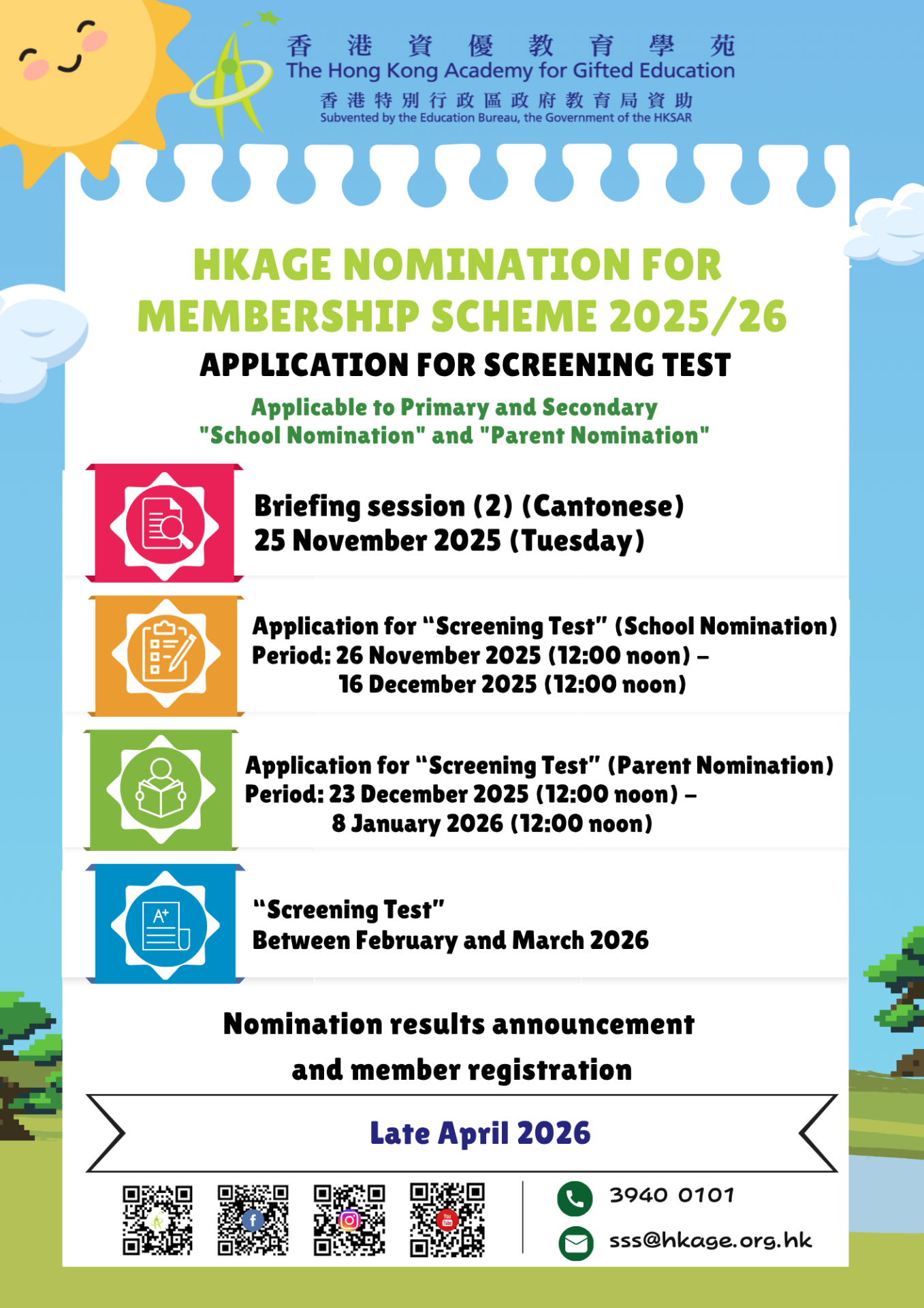 - The HKAGE will enhance the nomination scheme in the 2025/26 school year by introducing a new “Screening Test”. Students no longer need to submit their personal profiles.