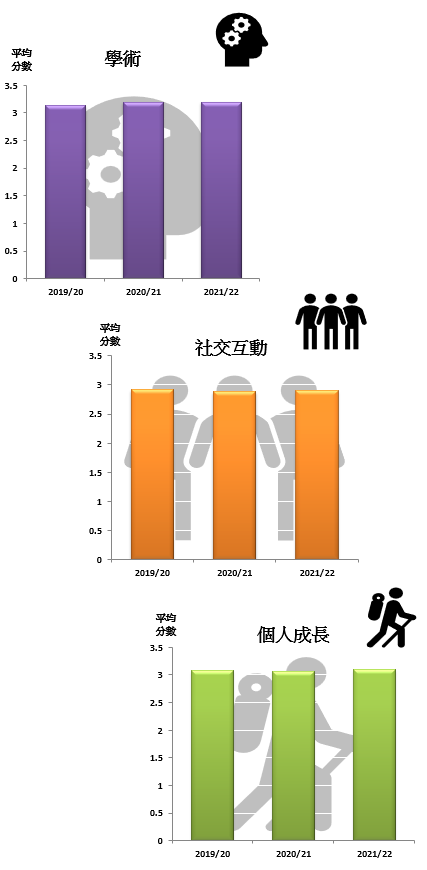 學術、社交互動及個人成長等方面的平均滿意度於各年大致保持平穩,於全時期均約達3分或以上。