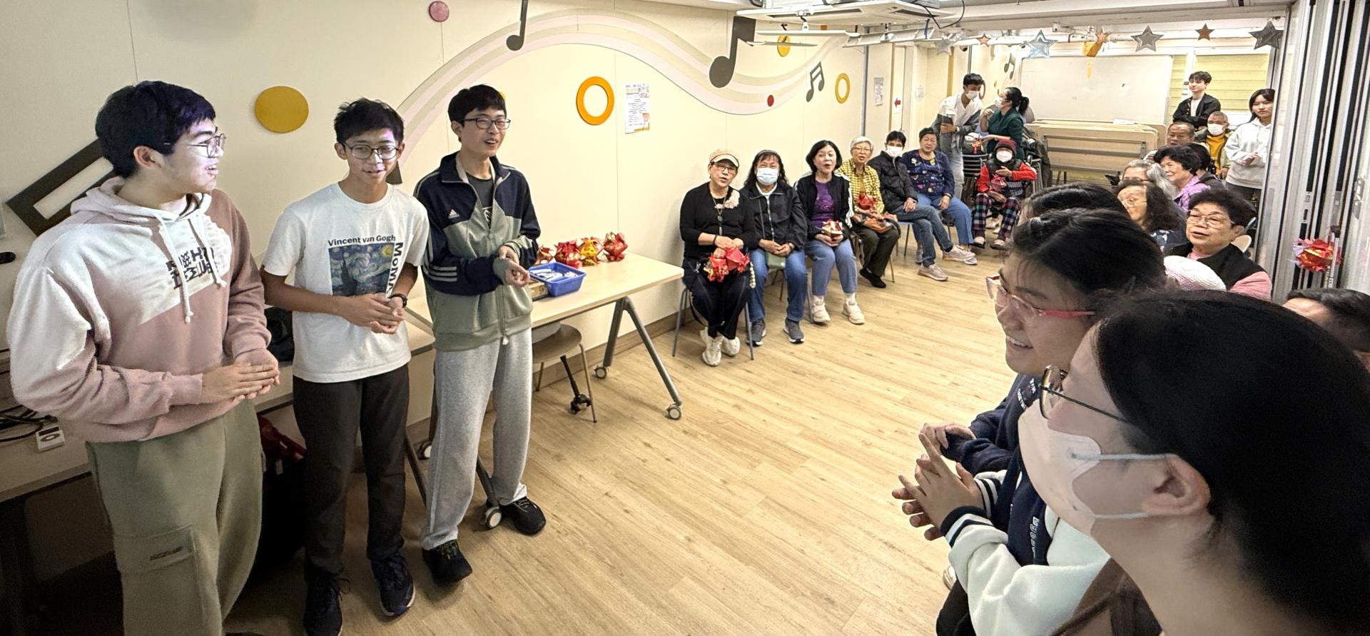 有份策划活动的中二学员王文森(Vincent)指,学员们花了不少时间构思与长者合唱的歌曲清单,「始终我们属于不同年代,大家熟悉的歌曲也不一样,因此我们花了点时间研究,找一些65岁至80岁长者喜欢听的金曲,又加插一些有节日气氛的歌。」他笑称,幸好「师徒计划」有学员喜欢听旧歌,集思广益下才选到这些经典歌曲。