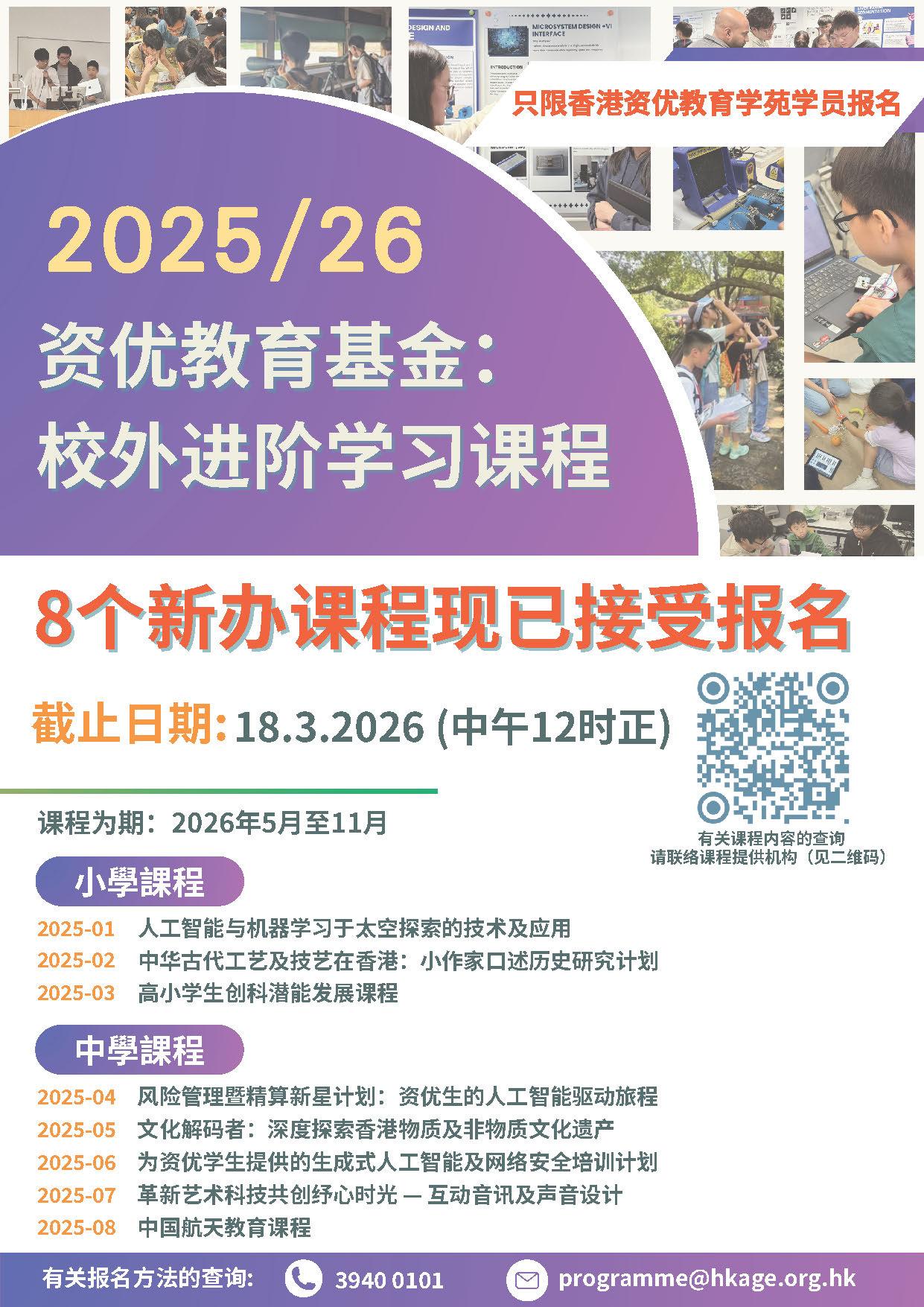 为发展资优学生的潜能,教育局透过「资优教育基金」资助了不同的机构举办校外进阶学习课程,于2025/26学年供香港资优教育学苑学员申请。